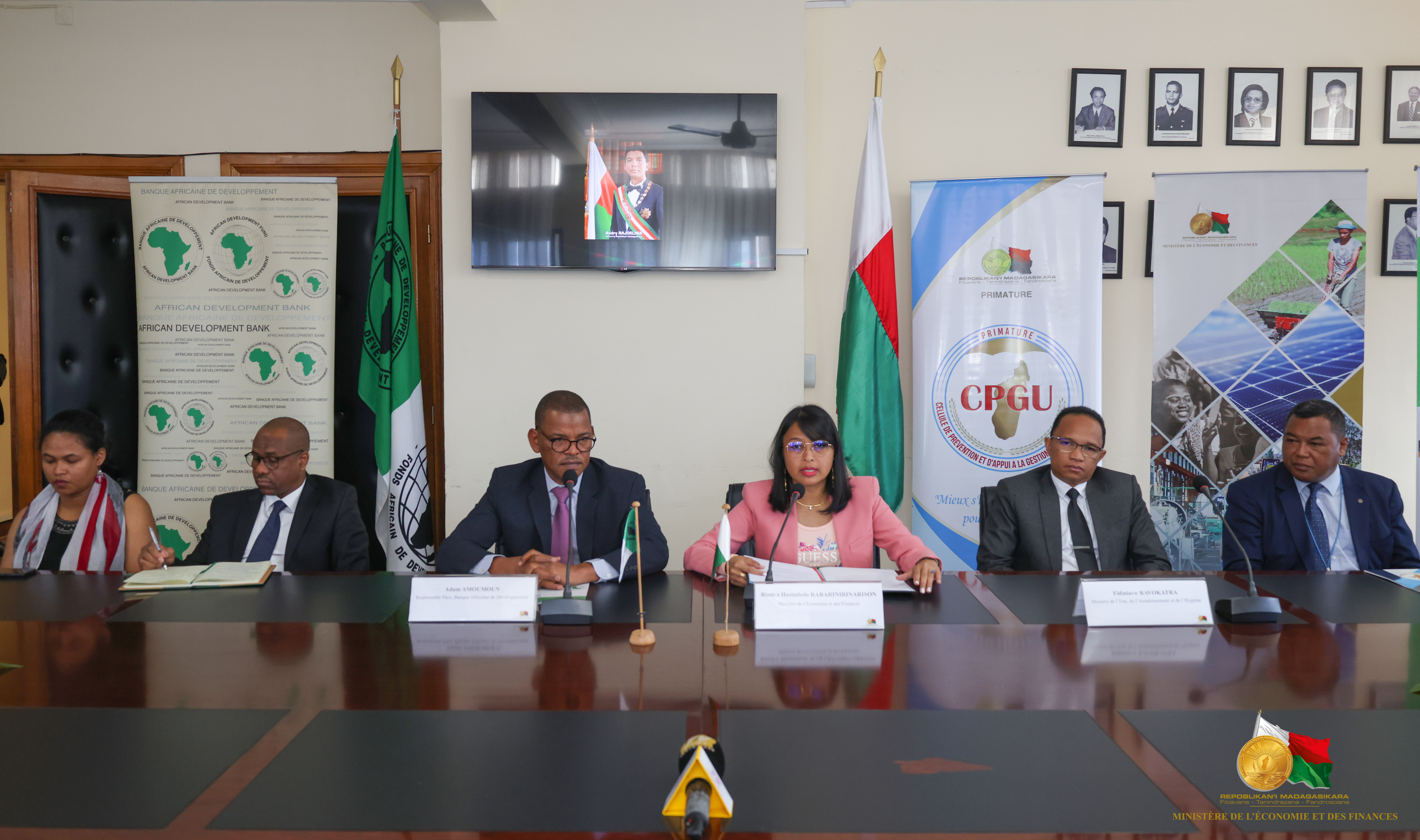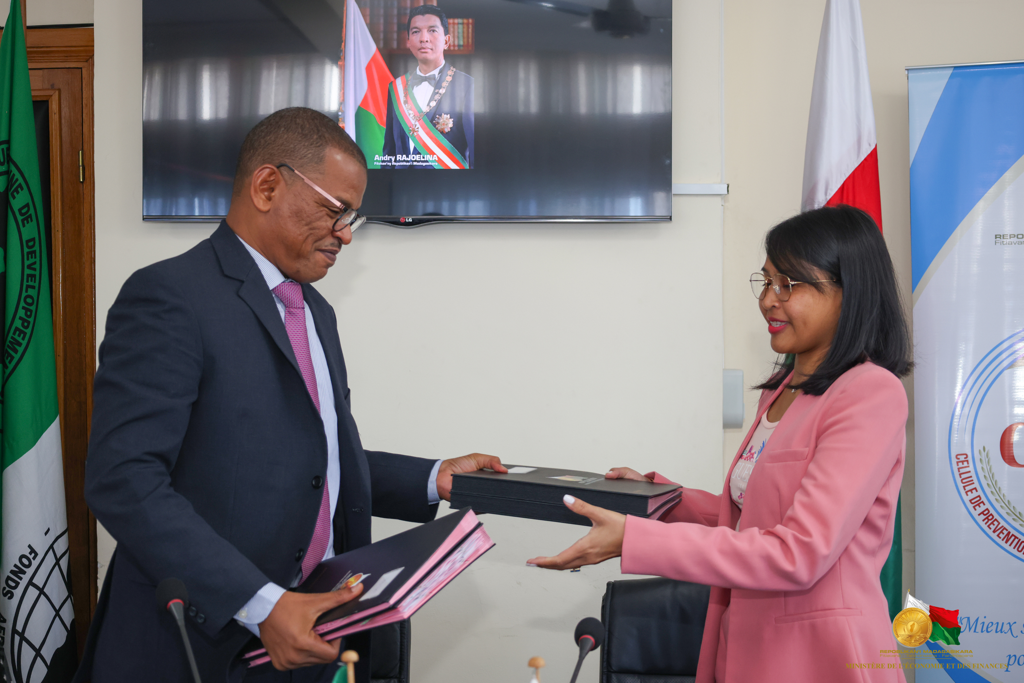 L'Etat Malgache, représenté par le Ministre de l’Economie et des Finances, Madame Rindra Hasimbelo RABARINIRINARISON et la Banque Africaine de Développement, représentée par son Représentant Pays, Monsieur Adam AMOUMOUN ont procédé ce jour, à Antaninarenina, à la signature de deux accords de financement.