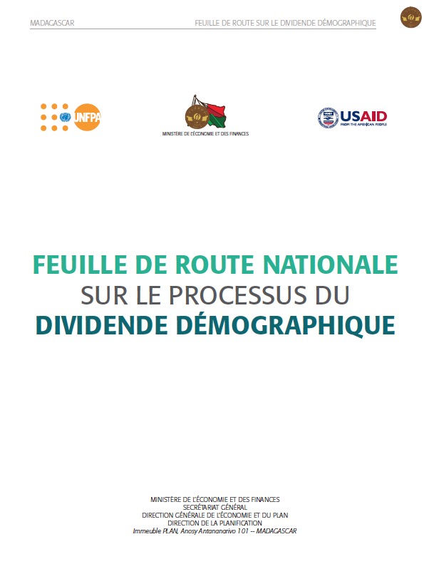 La Feuille de route nationale du dividende démographique (FR/DD) traduit l’engagement de l’Etat de faire la dynamique démographique comme levier de développement. Son élaboration, par l’équipe pluridisciplinaire sous la conduite du Ministère de l’Economie et des Finances, nécessitait une analyse approfondie des situations socio-économiques et démographiques de la population basées sur les divers documents-cadres existants. Elle permet une vue intégrée des différents domaines d’interventions ciblant les adolescents et les jeunes en rapport avec les quatre piliers et déterminants du dividende démographique. Ces quatre piliers formant la Feuille de route nationale sont : la santé et la Planification Familiale, l’éducation et le développement des compétences, l’emploi et l’entreprenariat, et la gouvernance. Le document fait ressortir les 28 actions clés et quelques activités prioritaires sur les domaines d’intervention prioritaires pour faire « Madagascar, un pays émergent » à travers l’exploitation de la potentialité des jeunes, une opportunité de développement économique accéléré. L’équipe en charge de l’élaboration de cette feuille de route s’est inspirée de la feuille de route de l’Union africaine en complémentarité avec la Politique générale de l’Etat.