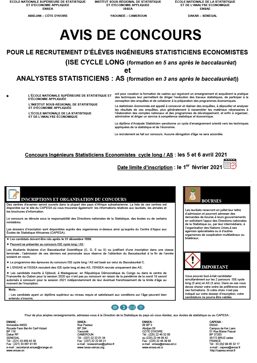 Recrutement d'élèves Ingénieurs Statisticiens Economistes (ISE) Cycle long / AS et Analystes Statisticiens - Télécharger