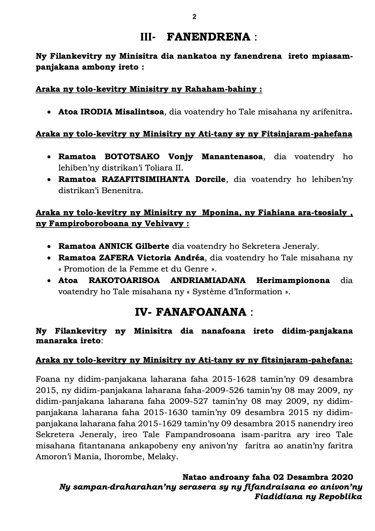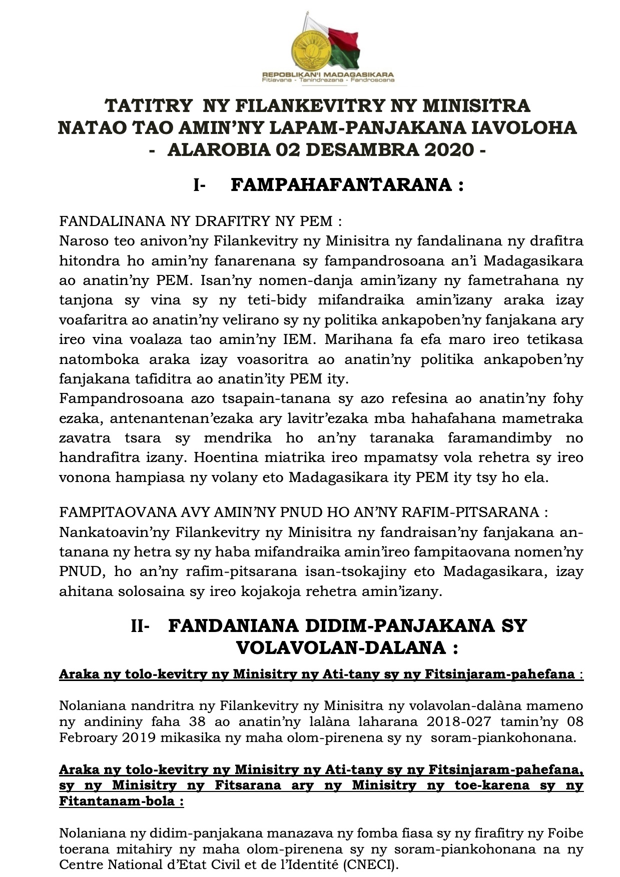 Tatitry ny Filankevitry ny Minisitra natao ny alarobia 2 desambra 2020