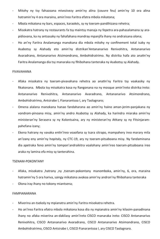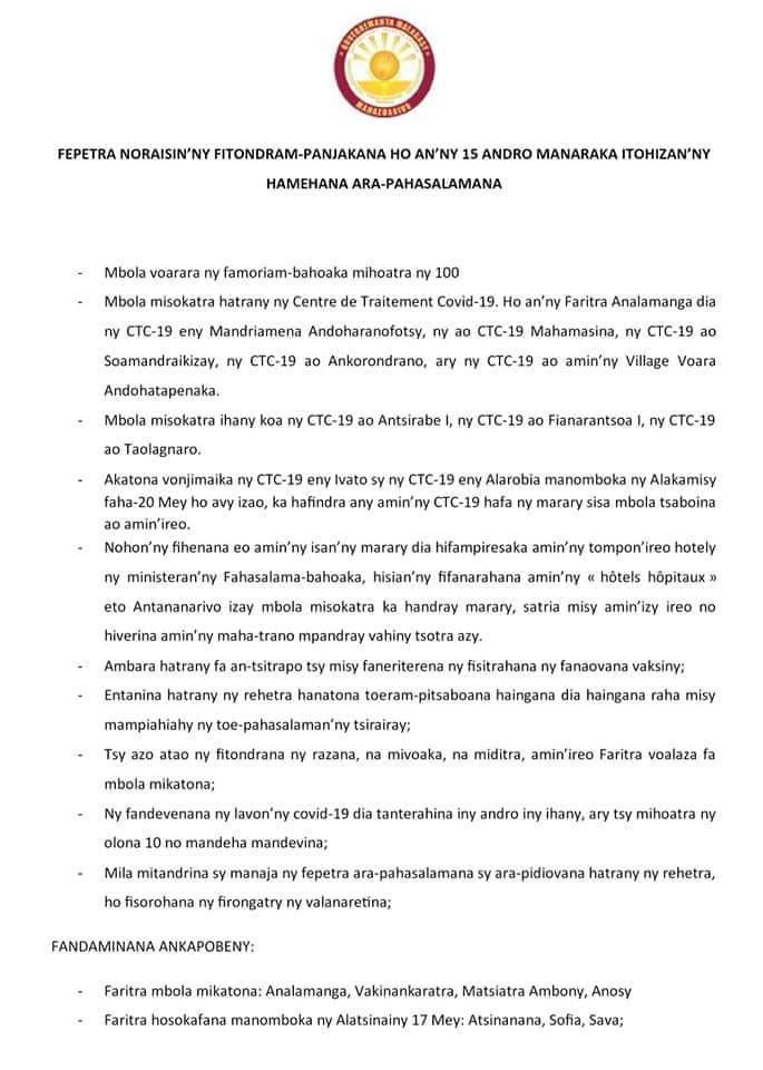 Fepetra noraisin'ny Fitondram-panjakana ho an'ny 15 andro manaraka itohizan'ny hamehana ara-pahasalamana