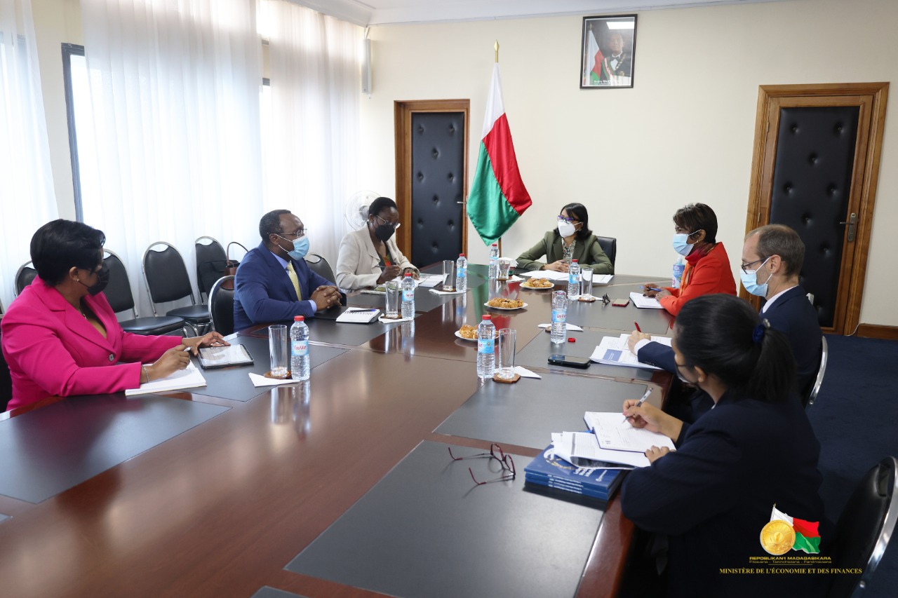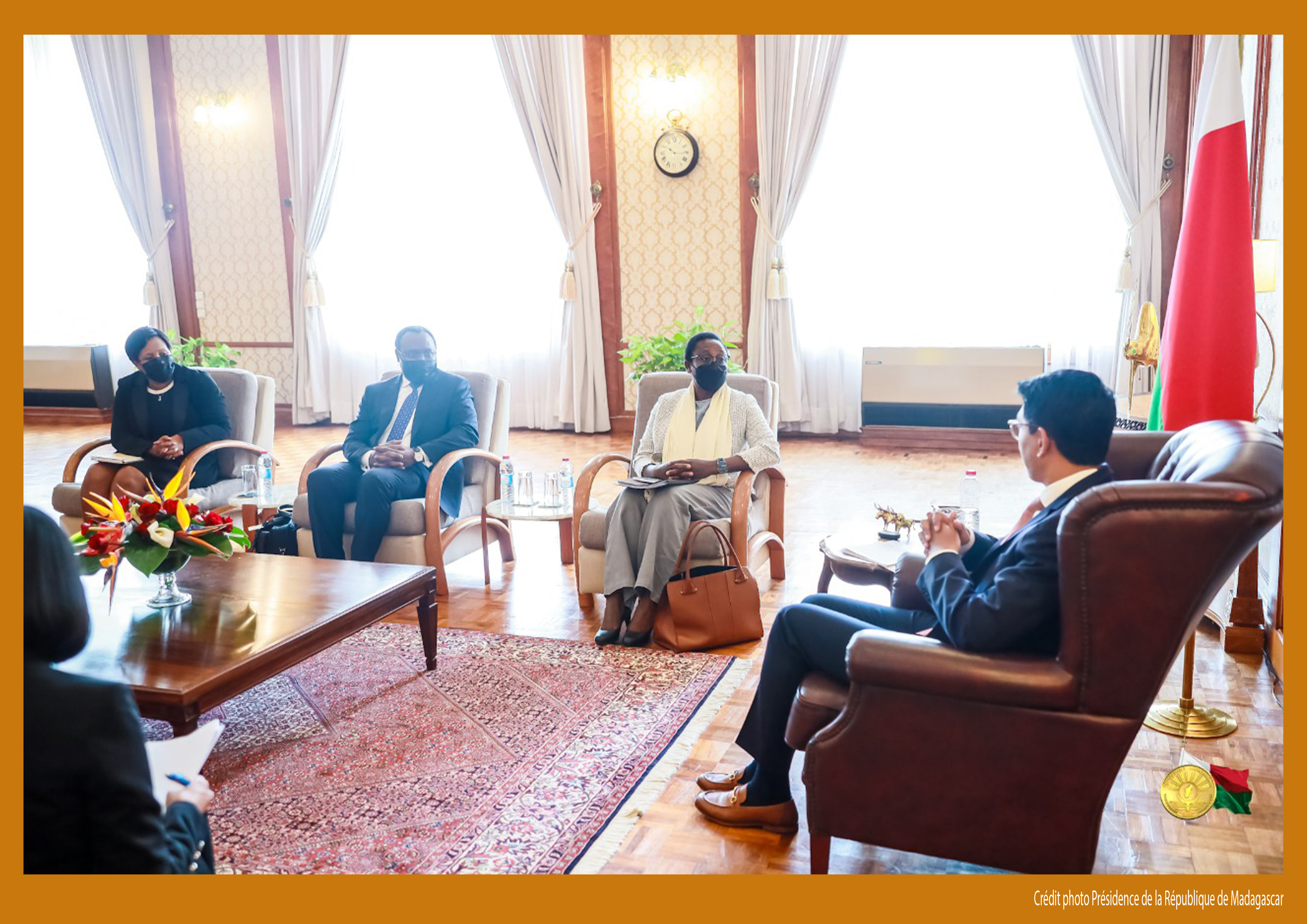 Iavoloha, le 23 février 2022 La délégation de la Banque Mondiale conduite par Idah Z. Pswarayi-Riddihough, Directeur des Opérations auprès de cette institution a été reçue par le Président de la République, Andry RAJOELINA, ce matin à Iavoloha. La veille, la délégation a été reçue par le Premier Ministre Christian NTSAY à Mahazoarivo après une séance de travail avec Madame le Ministre de l’Economie et des Finances, Rindra Hasimbelo RABARINIRINARISON. Plusieurs axes de coopération ont été abordés durant cette rencontre. Entre autres, la lutte contre la Pandémie du COVID 19, l’Education, la Santé, la Sécurité Sociale, le Transport, l’Agriculture et le développement de la région Sud de l’ïle. Par ailleurs, la probabilité d’appui au programme de l’Etat contre la dégradation de l’environnement a également été discutée. A savoir la reforestation de Madagascar et la réalisation des accords établis durant la COP 26.